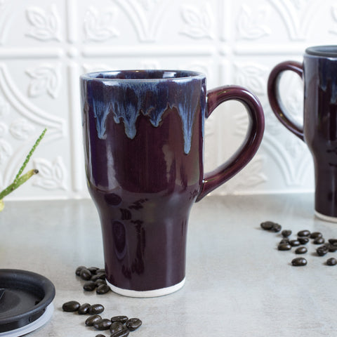 Eggplant Purple Ceramic Coffee Travel mug with handle and black lid