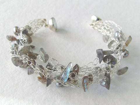 Petite and elegant earrings, wire-wrapped in Silver Wire,...Crocheted Lace Silver Bracelet / Clear Quartz & Pearls