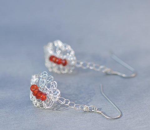 Earthy Crochet Knitted Lace Necklace, Silver Wire, Carnelian Citrine Freshwater Pearl