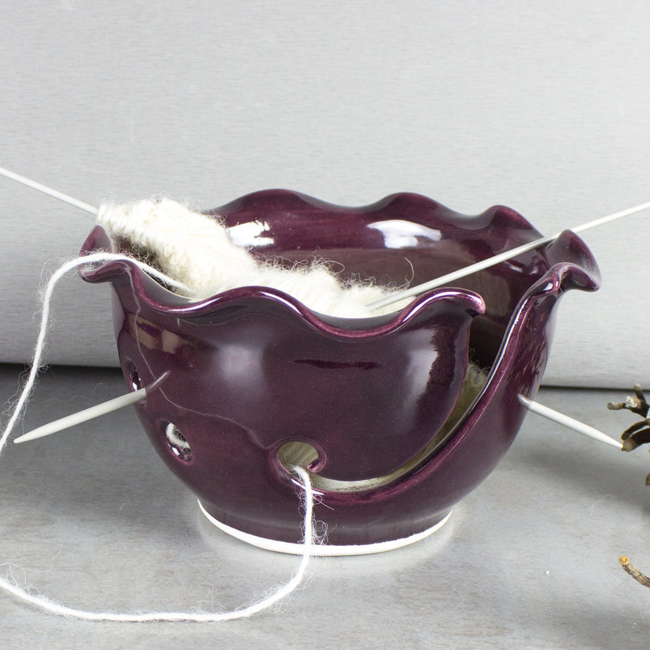 Ceramic Yarn Bowl, Knitting Bowl, eggplant purple crochet bowl