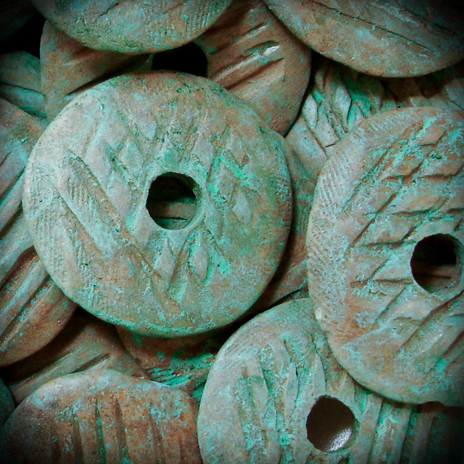 This listing is ONE large 35mm Greek Mykonos disk bead / a beautiful copper green patina disk pendant.